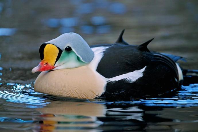 欧绒鸭,一种在一个多世纪前的冰岛就已经受法律保护的个体较大的极地野鸭,拉丁语叫 Somateria Mollissima。雄鸭的上体主要为白色,头顶、腹和尾黑色。体大而圆,喙有隆起。雄绒鸭毛色一般为黑白相间,而雌绒鸭身体的大部分则呈褐色。绒鸭每年春天都聚集栖息在北大西洋沿岸筑巢,雌绒鸭会从自己身上啄下 17 克左右棕灰色、非常轻的羽绒于鸟巢中保温孵化 4-5 只鸭蛋。在小鸭被孵出以后,所有欧绒鸭都会返回到海洋中去。而留在鸟巢的棕灰色羽绒就是全世界独一无二的欧绒鸭绒原料。